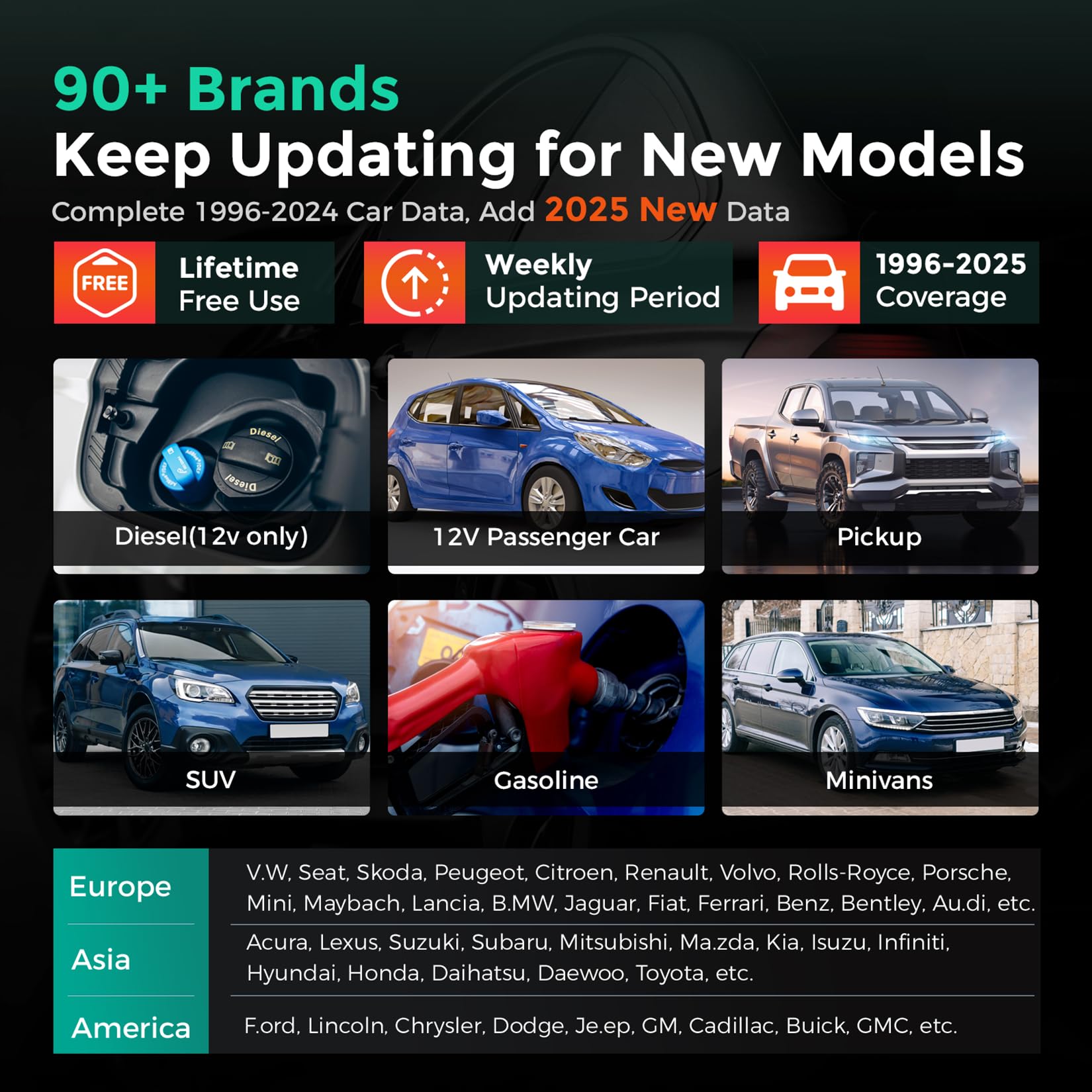 - 【Lebenslanges Update Diagnosegerät】 Ein Klick WiFi Update zur Behebung weiterer Fehler, behalten Sie die neueste Software immer und aktualisieren Sie neue Make-ups bis 2023 Modelle, Autos, SUVs, Minivans, 12V-Leichtlastwagen. Dieser Autodiagnosescanner für alle Autos funktioniert mit OBD2 Autos von 1996 und neuer und deckt asiatische, europäische, amerikanische und indische Automarken ab. Hinweis: Für 4 Systemdiagnosen, arbeiten Sie besser mit Autos im Jahr 2006 oder später.